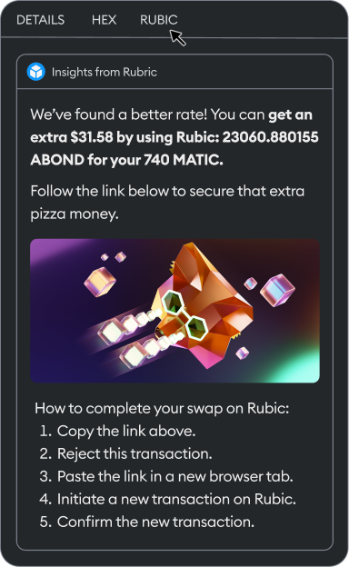 Discover the most efficient path for your crypto swap with Rubic’s Best Rate Finder. We actively sift through over 200+ DEXs in real-time, ensuring you get the best crypto exchange rates comparison, all seamlessly aggregated within your MetaMask wallet. Enhance your trading with superior liquidity and smart route optimization.